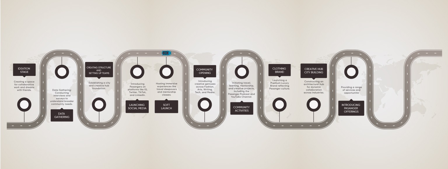 The chattering noises, the bumps, the music, the snacks, the stops, and the sights—these are what will be remembered on every really good journey. The Pasangers' journey to creating a thriving, collaborative creative city that fosters innovation, mind shifts, personal growth, and community through a structured path from ideation to globalization. We are not just a trip to a destination; we are the Pasangers, we are the Journey.
